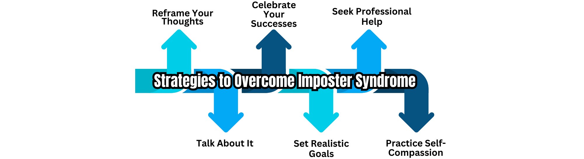 Create an image depicting the process of overcoming Imposter Syndrome. This could include visual representations of the triggers, followed by the strategies used to overcome them, such as reframing thoughts, sharing feelings, celebrating successes, setting realistic goals, seeking professional help, and practicing self-compassion. The image should convey a journey from self-doubt to self-confidence.